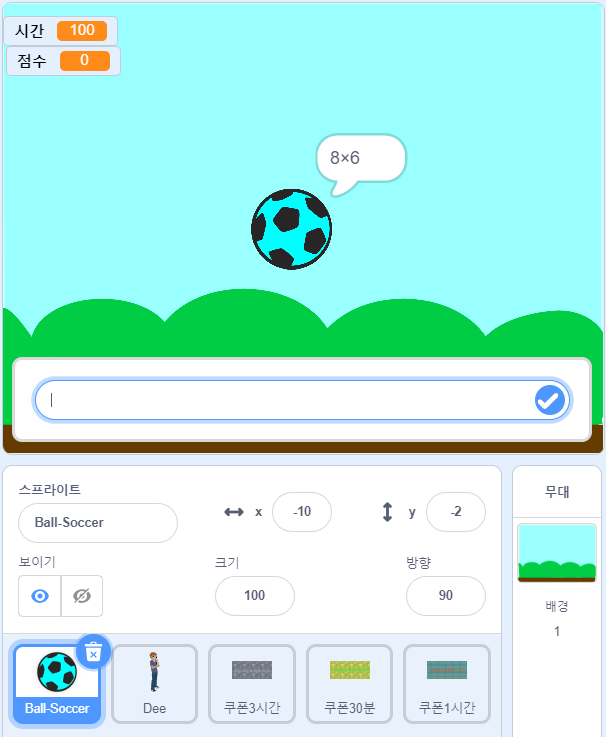 100초 동안 100점을 맞으면 랜덤쿠폰을 받을 수 있어요~~